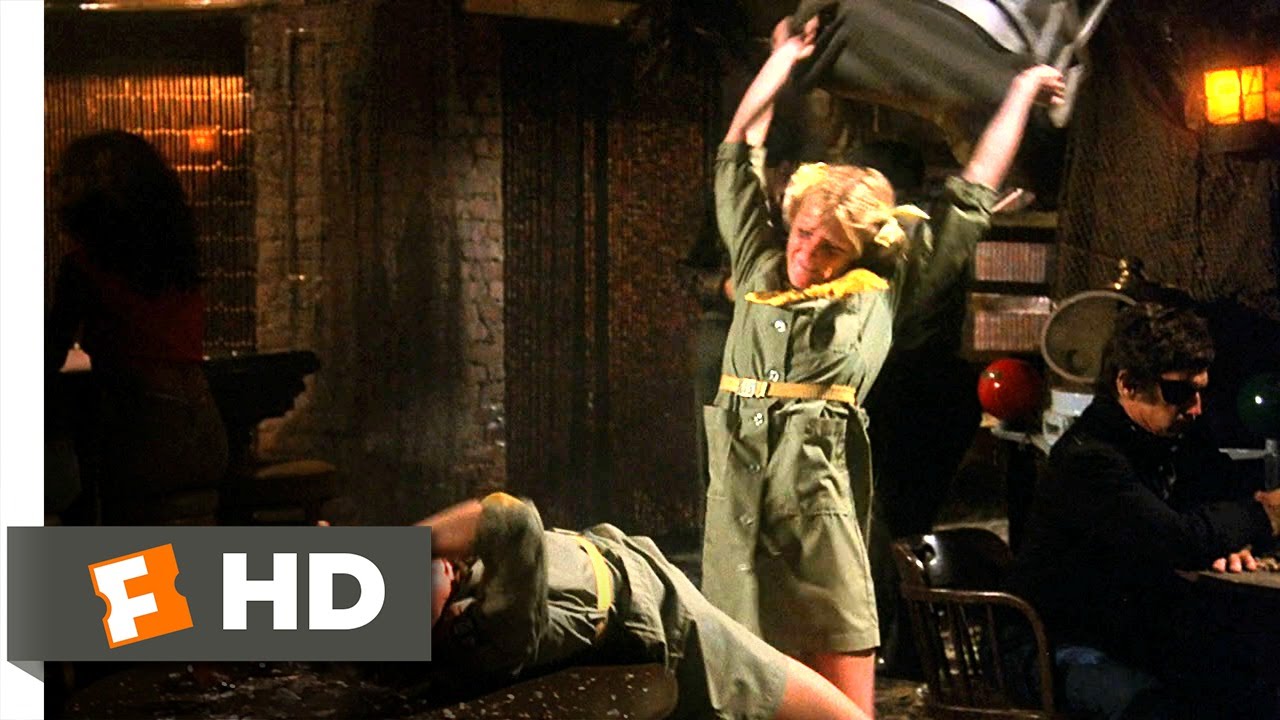Hence, my favorite cinematic fight scene is from Airplane, where two girl scouts, in an argument over cards, go to it. There is no gradual escalation, just instant violence. Using whatever is at hand, including furniture, they use the entire bar as their ring, with the other patrons obviously used to their outbursts. The coup de grace move, with the girl’s head jump starting the jukebox, makes for an appropriate link to the subsequent dance scene.
